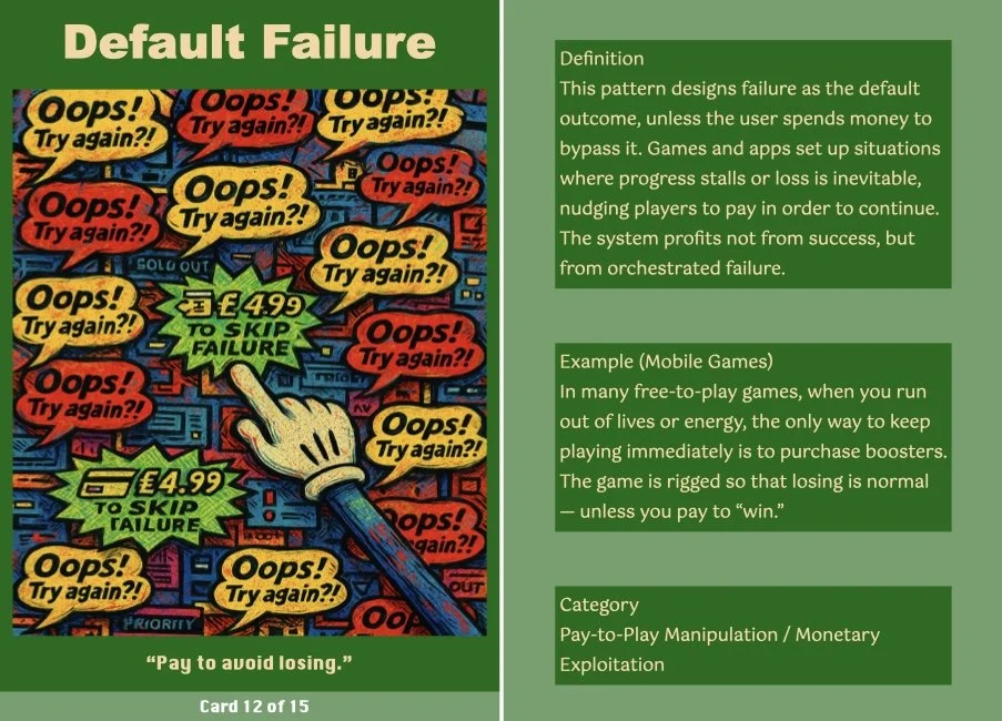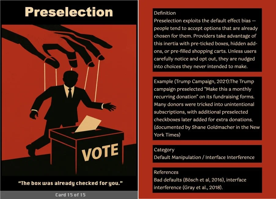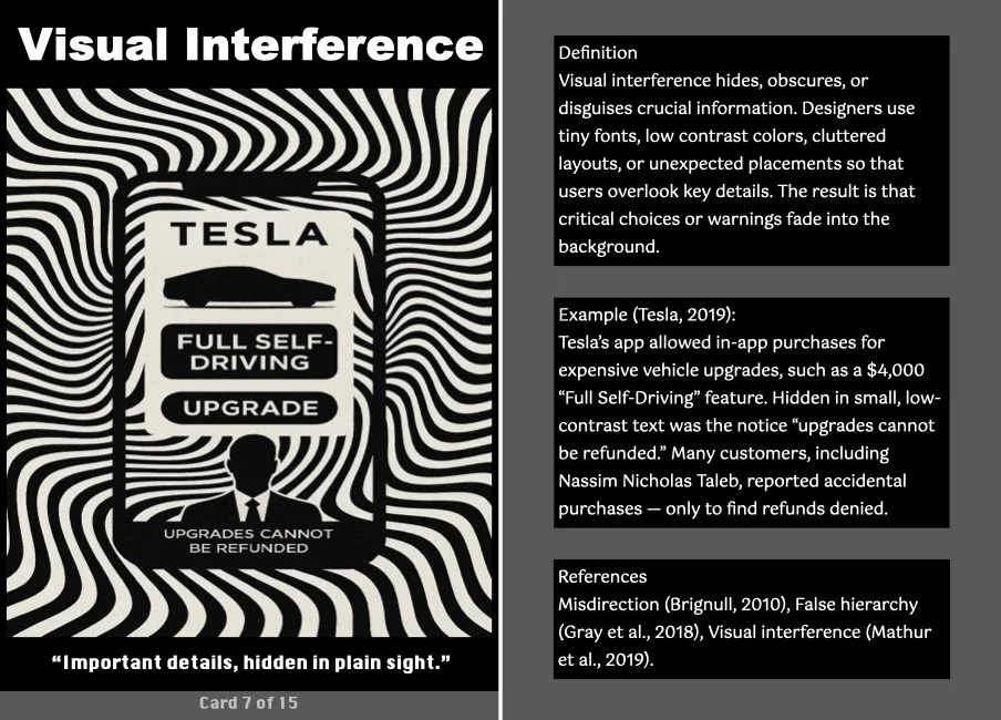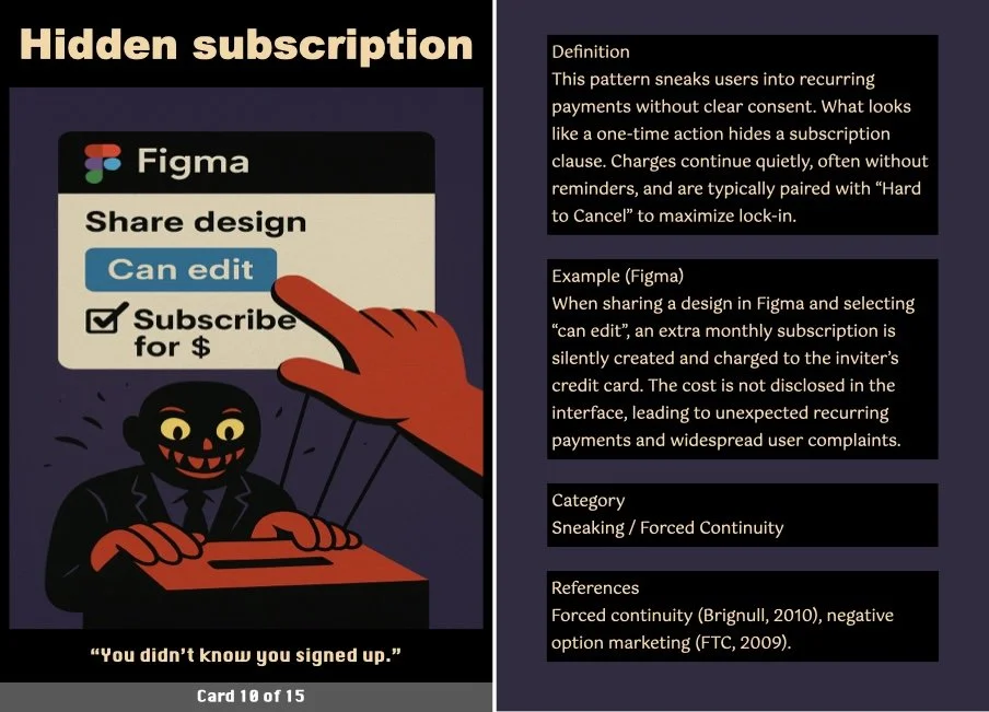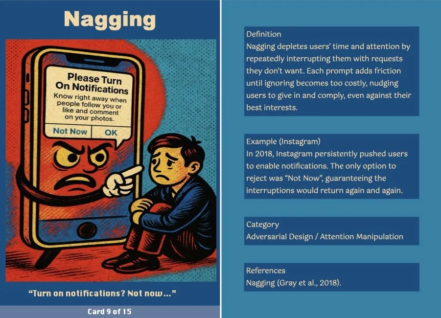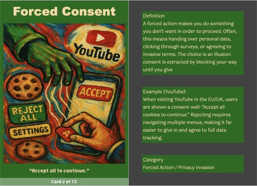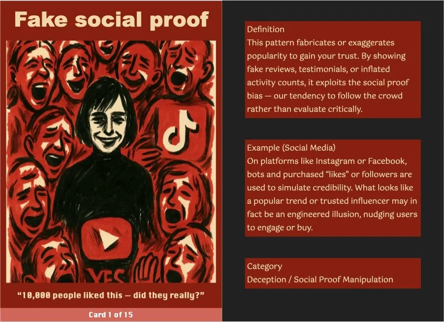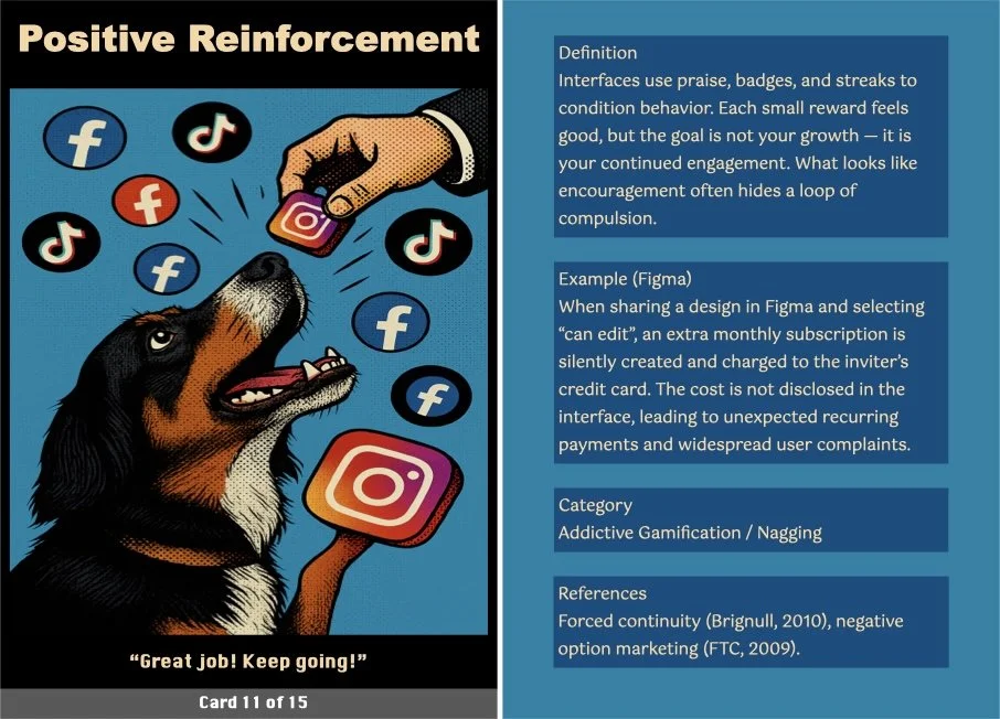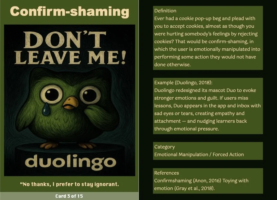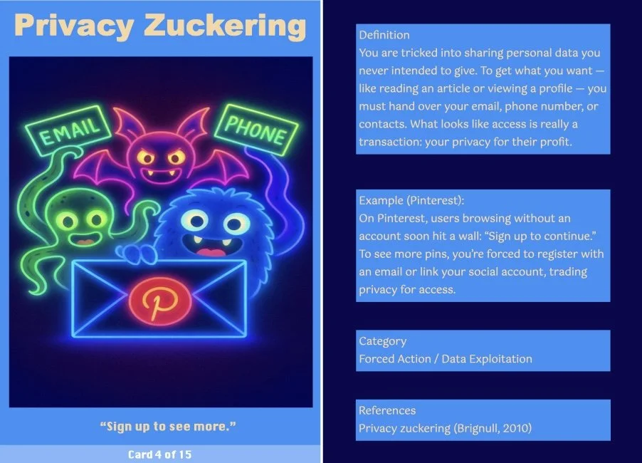 This ritual transforms the critique into a tangible takeaway, making it a more engaging and interactive experience. The cards serve as both mementos and critical prompts, inviting users to reflect on how these patterns operate in their own digital lives.