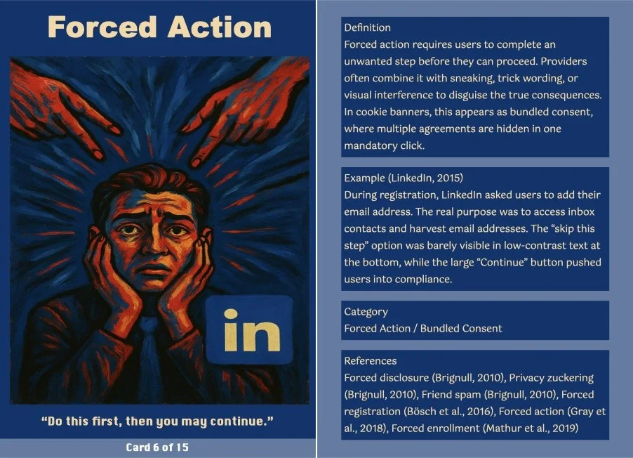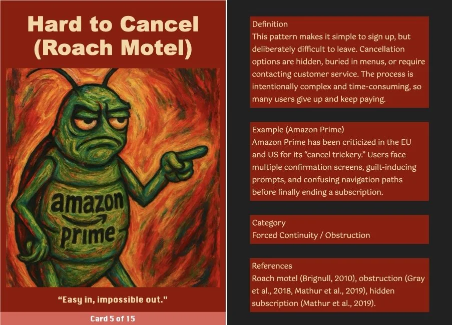 As a final gesture, visitors are invited to draw a printed card from a deck. Each card represents a real-world dark pattern, such as ‘Roach Motel,’ ‘Privacy Zuckering,’ or ‘Confirmshaming, and links it to a known digital platform like Facebook, TikTok, or Adobe.