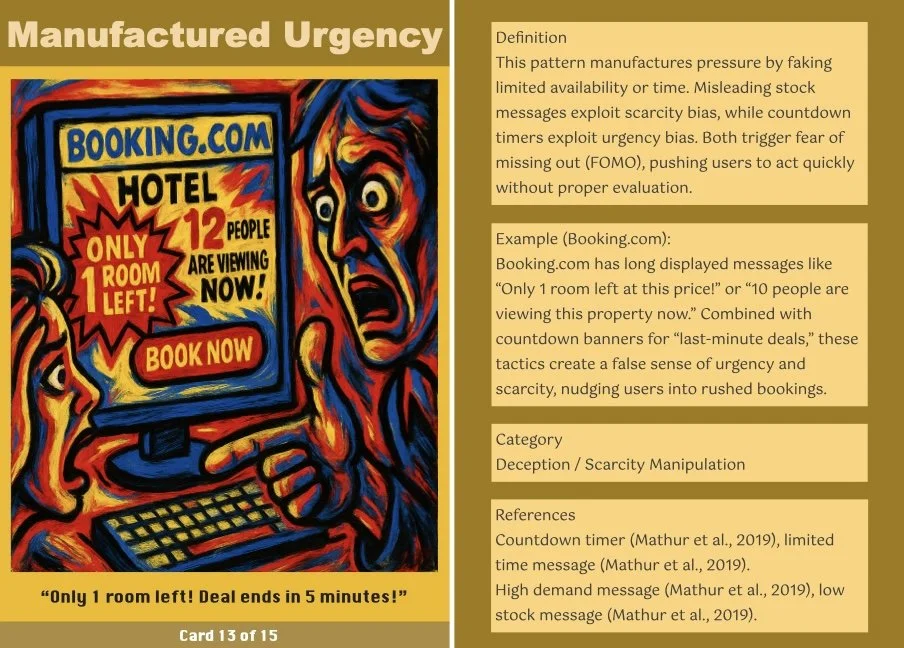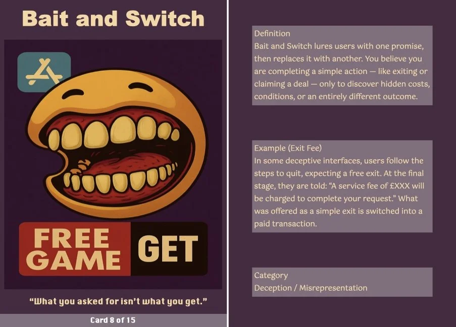 These reactions suggest that manipulative design doesn’t rely on visual deception alone. Instead, its power lies in how it conditions user behavior over time, through uncertainty, repetition, and emotional friction. This helps the project reframe dark patterns not as static visuals, but as temporal, embodied systems of control. Feedback also informed key refinements, including the addition of the final card-drawing ritual and the hesitation-triggered alarm.