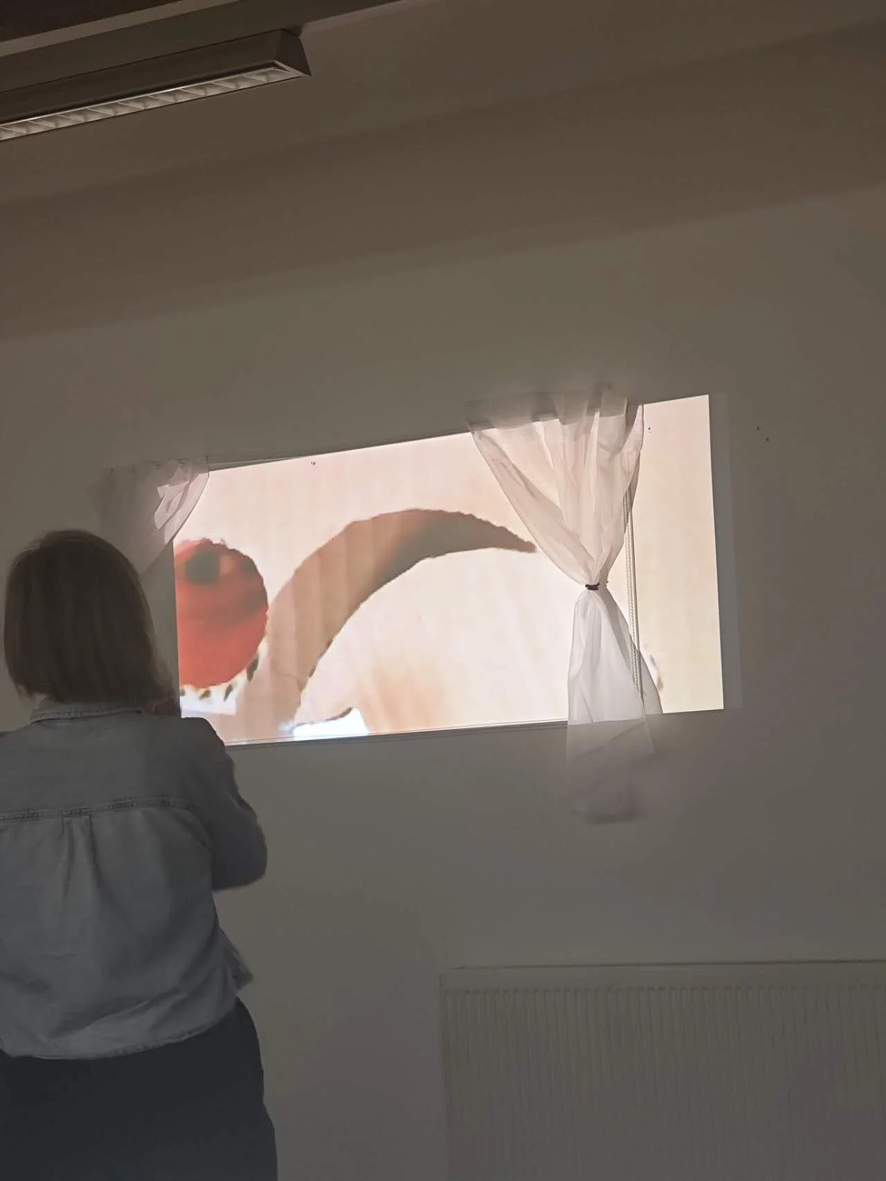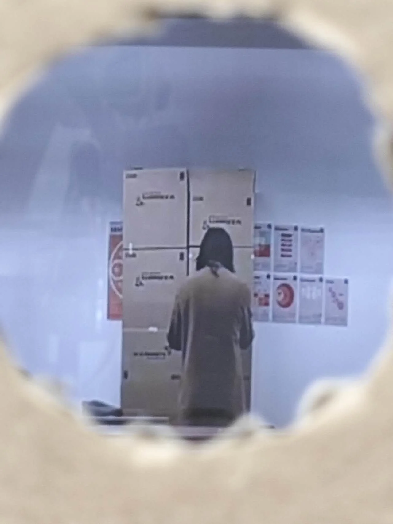 One of the most technically and conceptually innovative components of the work was the Arduino-controlled peephole device. When a viewer approaches, an infrared sensor triggers the opening of a concealed cover, enabling the camera to capture a close-up of the participant’s eye. Simultaneously, a second live camera records their back, which is then displayed within the space. This dual camera system creates a moment of uncanny mirroring: the spectator becomes the spectacle, caught between voyeurism and vulnerability.