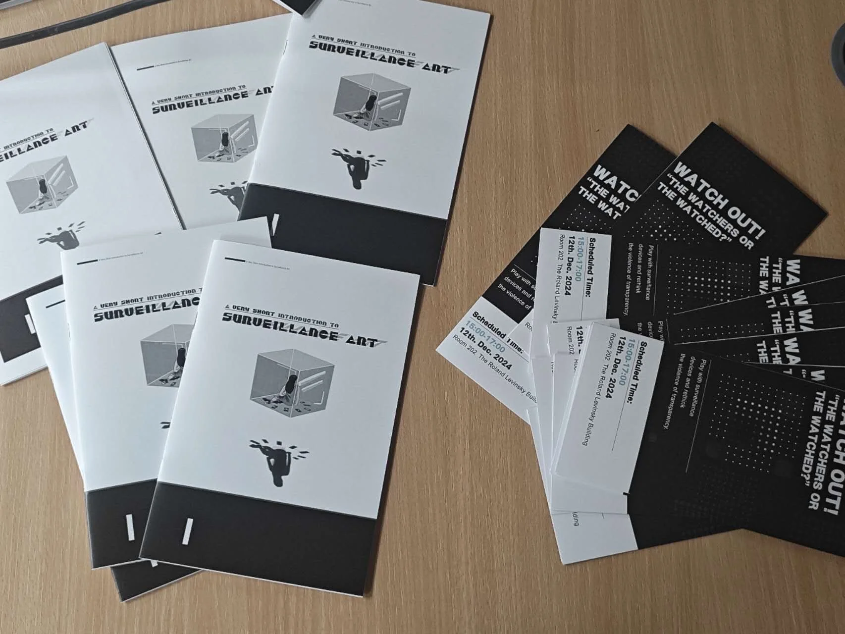 During the initial stages of development, I produced two booklet-style visual artefacts: Glass House: The Growing Openness of Private Domain, and A Very Short Introduction to Surveillance Art. These were displayed alongside the installation to provide critical context, inviting audiences to reflect on historical genealogies of surveillance and its contemporary entanglements with neoliberal transparency and performativity. The design of the printed matter emphasized rhetorical structure and visual logic, drawing from design semiotics to heighten critical engagement.